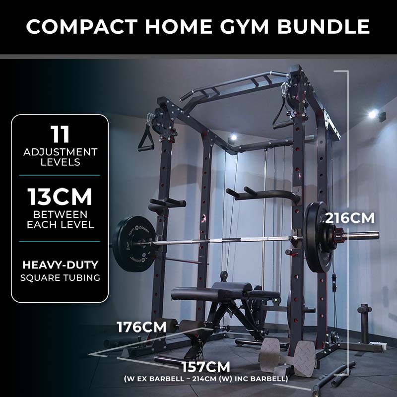 - 7FT 20KG ESSENTIAL BARBELL (OPTIONAL): Depending on the variation you choose, the bundle includes an Essential 7ft/2200mm Silver Barbell. Providing an extra 20kg to your set up, secure the barbell to the J-Hooks on the rack or use it with the 360⁰ landmine sleeve and T-bar attachment to perform a range of extended exercises. When not in use, the barbell can neatly be stored upright in the holder at the rear of the rack.