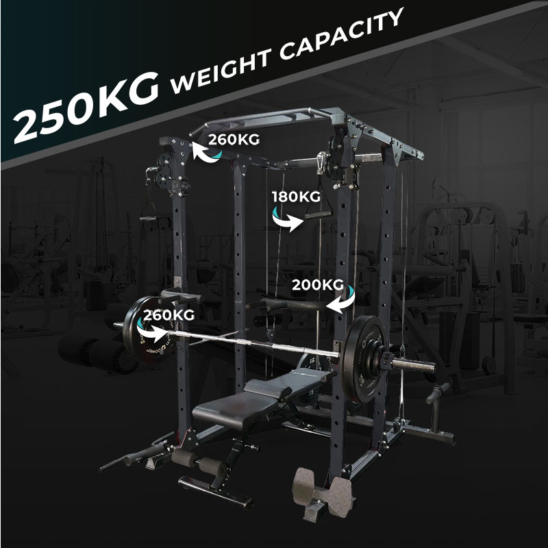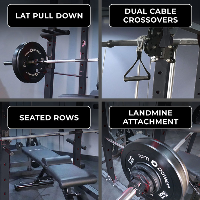 - Multiple practical attachments, incl. lat pull down, dip station, J-hooks, pull-up bar, low-row plate, landmine sleeve and more