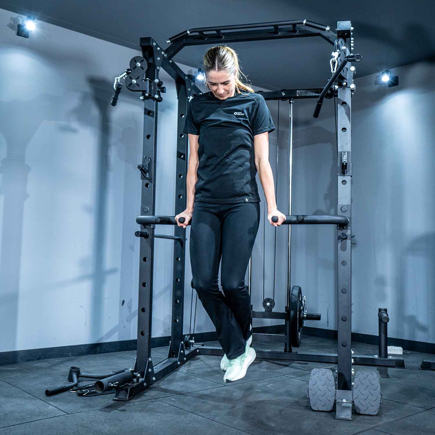 - Dip station: 2 x removable steel dip station bars with two grip variations.