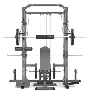 SPACE-SAVING HOME GYM: The Multi-Gym Crossover with Smith Bar has a dual storage holder at either side of the rear frame for storing multiple plates and two barbells. Plates can also be stored on the Smith bar or plate loading cable system.