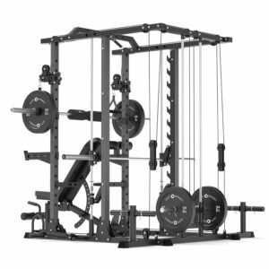 The upgraded version of our Crossover Cable Multi-Gym, this model, while very similar to its predecessor, boasts a range of additional features, including an integrated Smith bar. The Multi-Gym Crossover with Smith Bar is a solid option for both beginners and seasoned lifters who are looking for an all-rounder cable machine with the added safety of a Smith machine. You can purchase the Crossover rack as a single Multi-Gym or as part of one the bundle deals listed in the “Description” section.