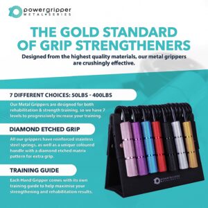 Diamond etched matrix patterns on the handles provide maximum grip during use, whether gently rehabilitating an injury or simply working your way up the range to build crushing grip strength. The matte black anodised steel springs provide smooth, progressive resistance as you squeeze and are rated as follows: