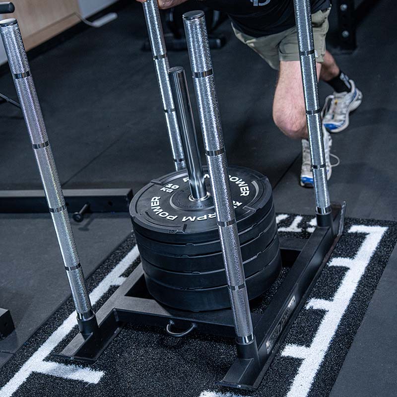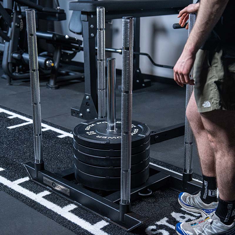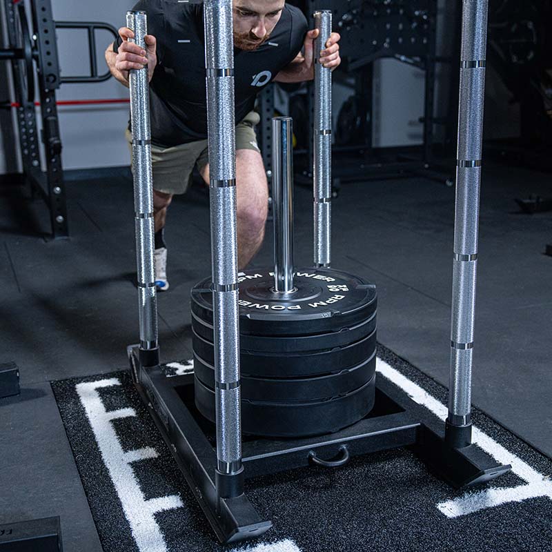 Prowler Dog Sled Elite: The RPM Power Prowler Dog Sled Elite is engineered for high-performance strength and conditioning, built from thick-gauge commercial steel to deliver exceptional stability under heavy loads while maintaining smooth, low-resistance movement on turf. Featuring reinforced skis, a chrome-plated central weight post, and knurled grip handles with marked hand placements, the Elite sled is designed for powerful push, pull, drag, and sprint training. Taller and heavier than the Essential model, it is optimised for heavier loading and competition-style training, making it ideal for elite athletes, commercial gyms, and Hyrox-style conditioning.